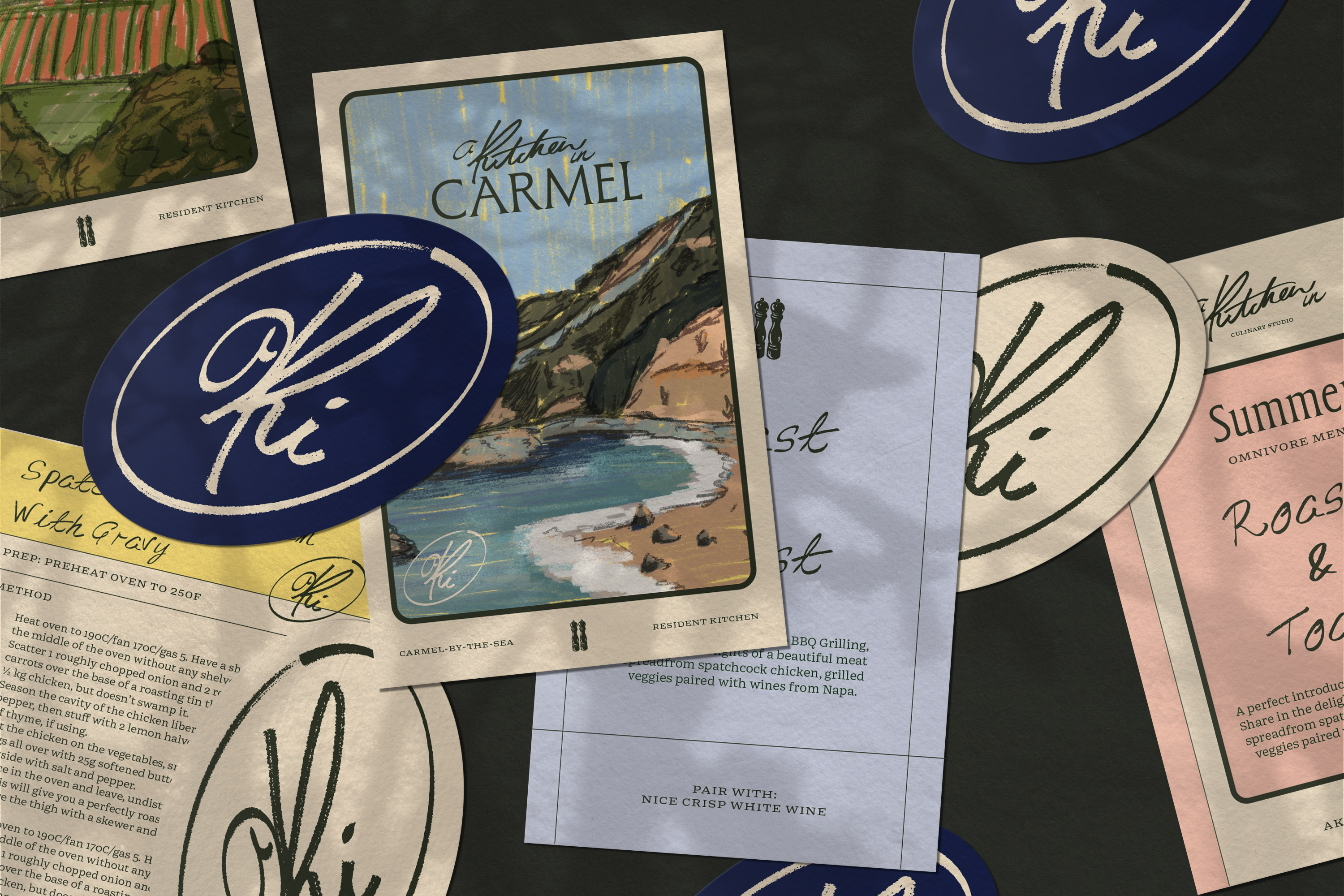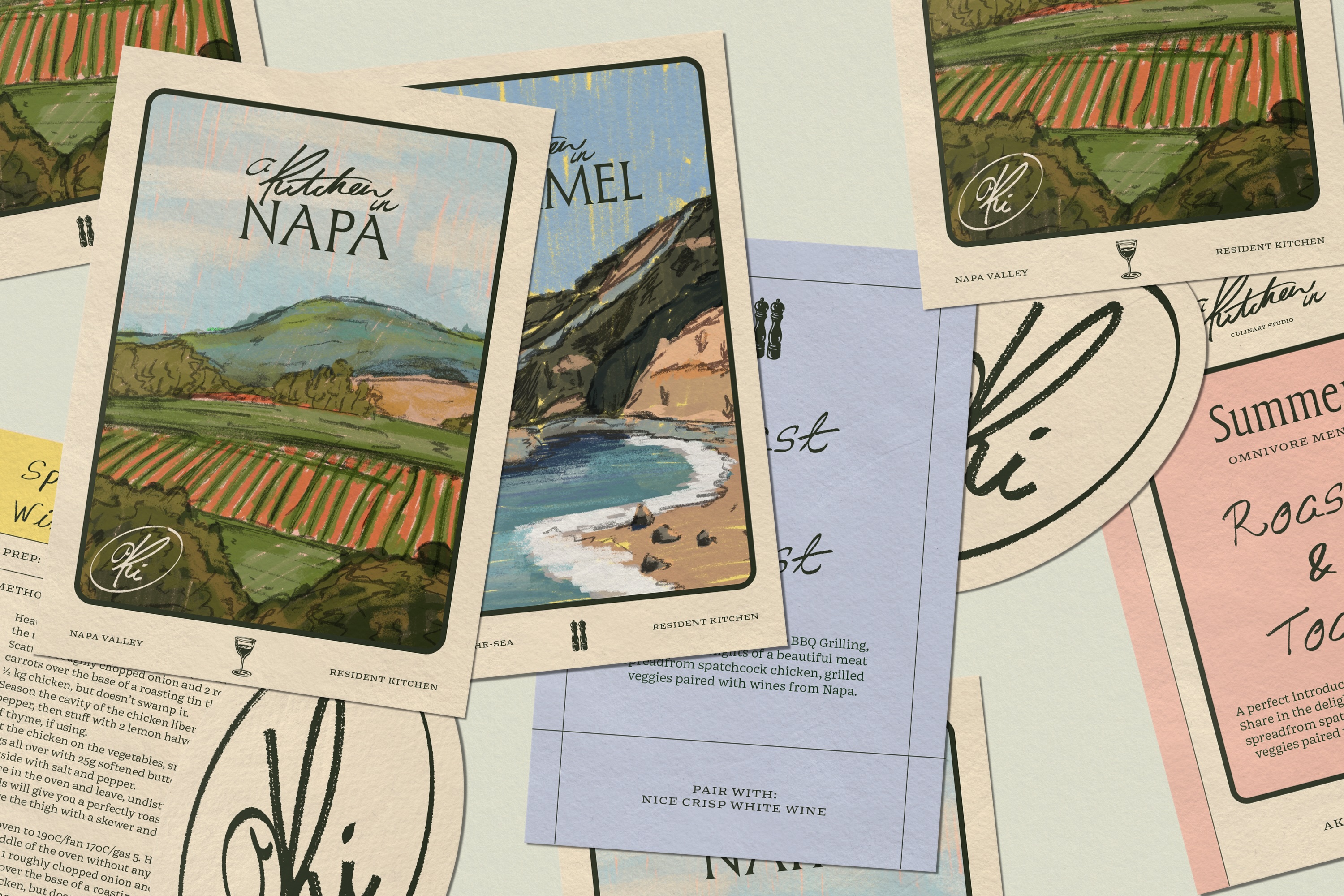 The brand identity takes inspiration from the timeless ritual of recipes passed down through generations. A custom handwritten mark anchors the identity, paired with an elegant serif, a typewriter-style font to balance heritage with modernity and a bespoke typeface. Colourful pencil illustrations capture the charm of each kitchen and pop-up location, layering bright hues with grounded, rich tones. Recipe postcards double as tasting menus - designed to be treasured keepsakes as much as functional guides - adaptable in both landscape and portrait formats.